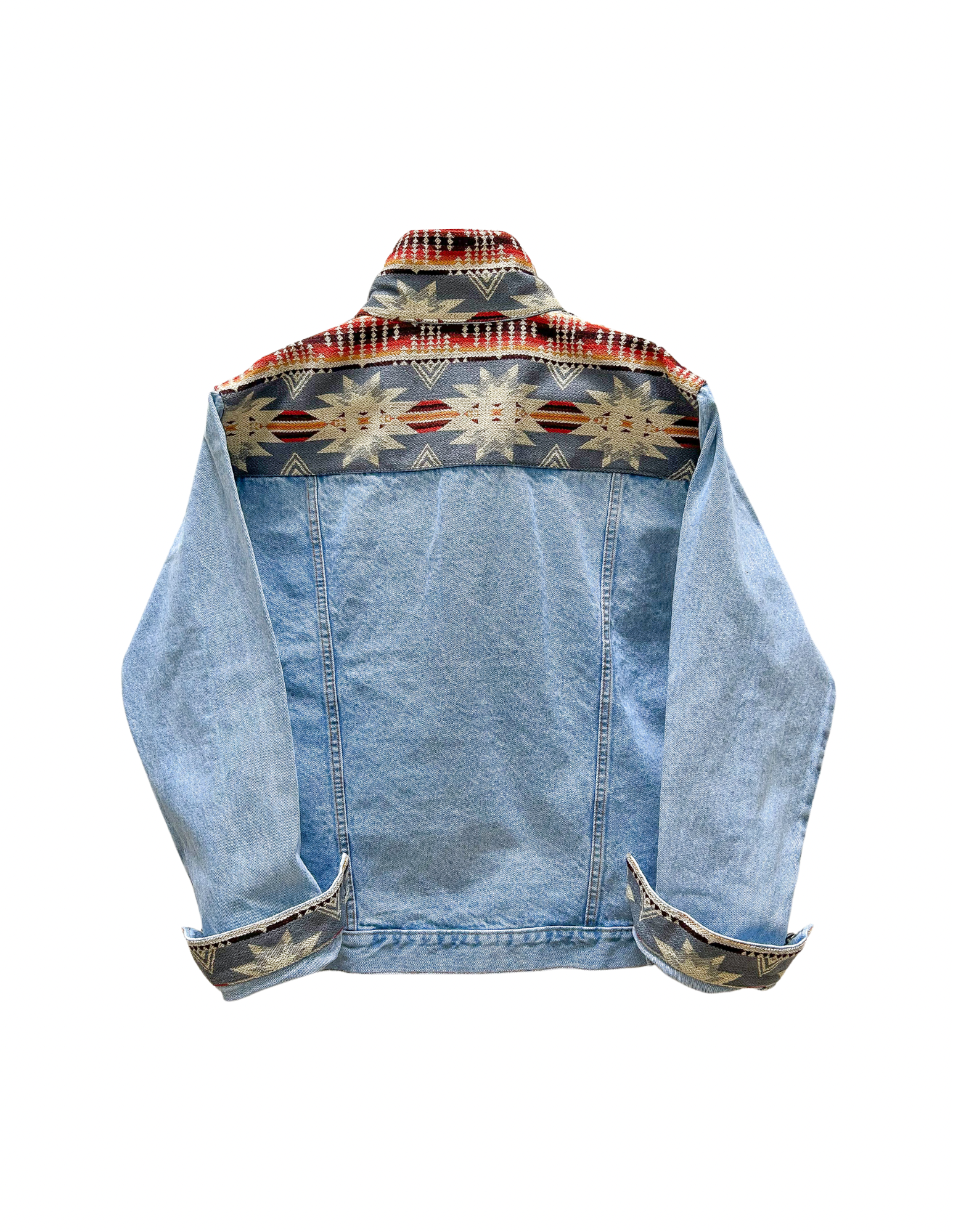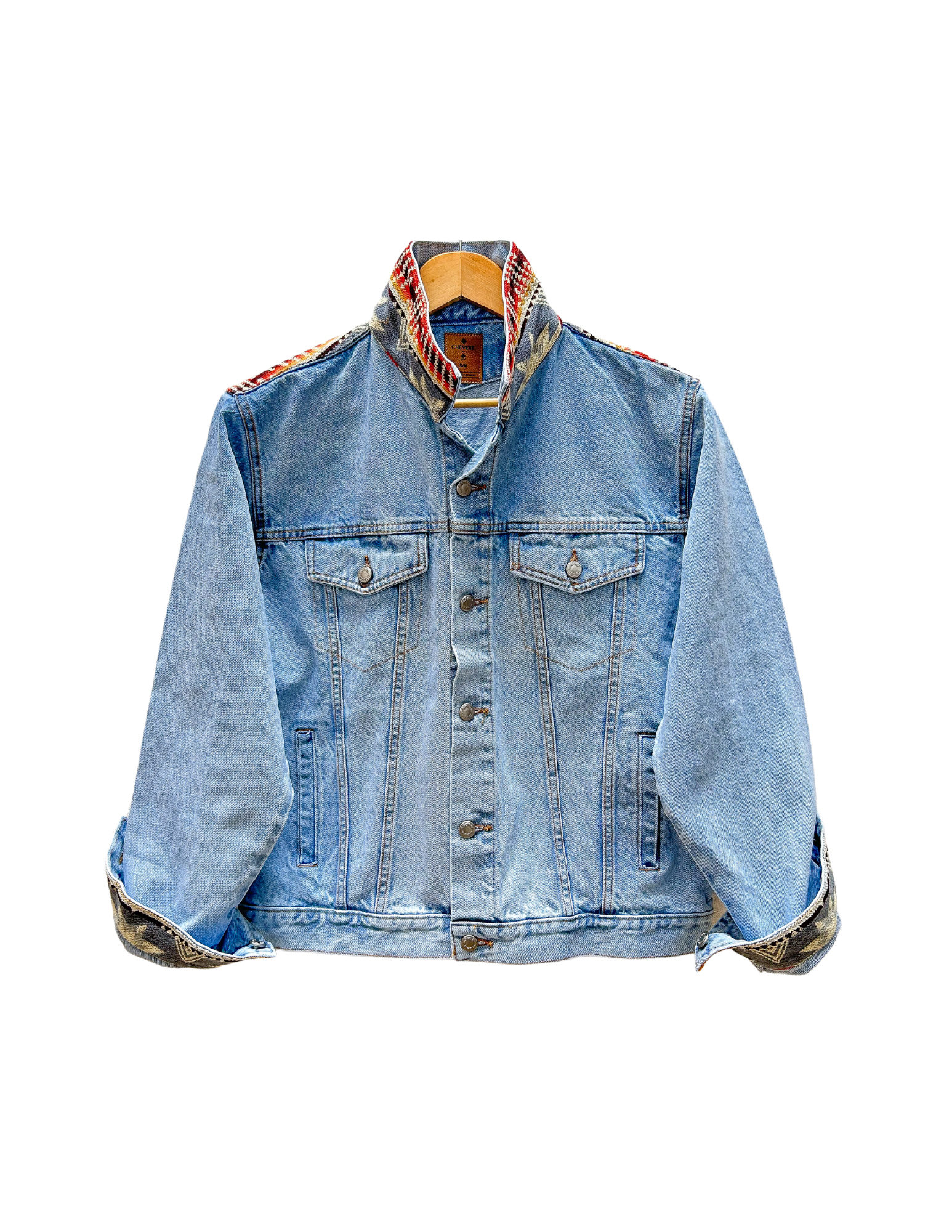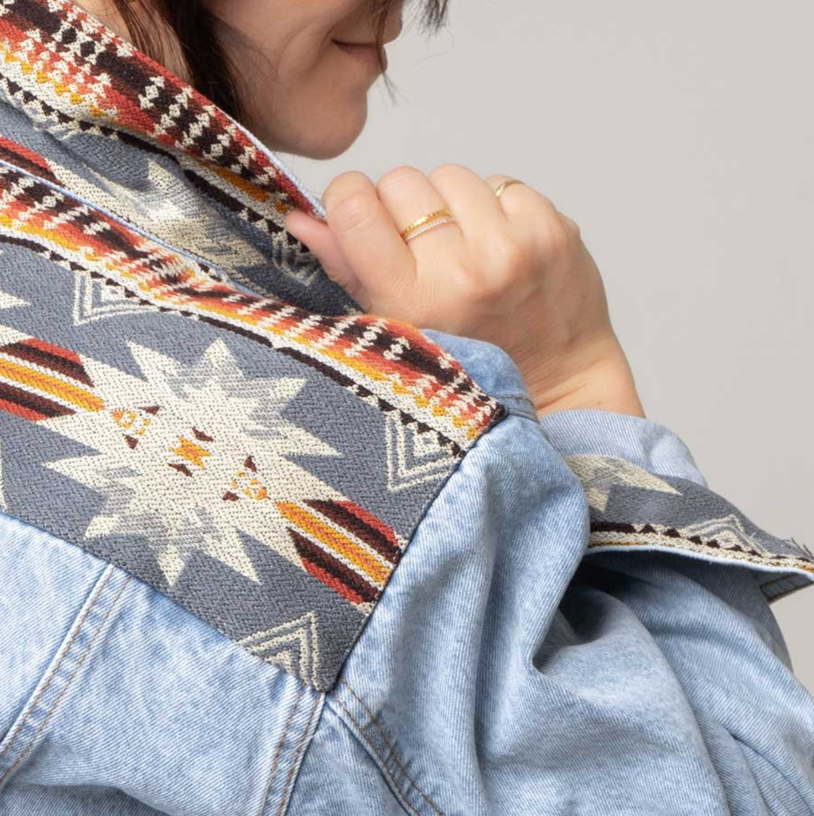 La chaqueta "Alba Gris" combina denim premium en tono azul frost con tela andina gris, simbolizando un amanecer nublado, mientras que los tonos naranjas representan la calidez del sol naciente.