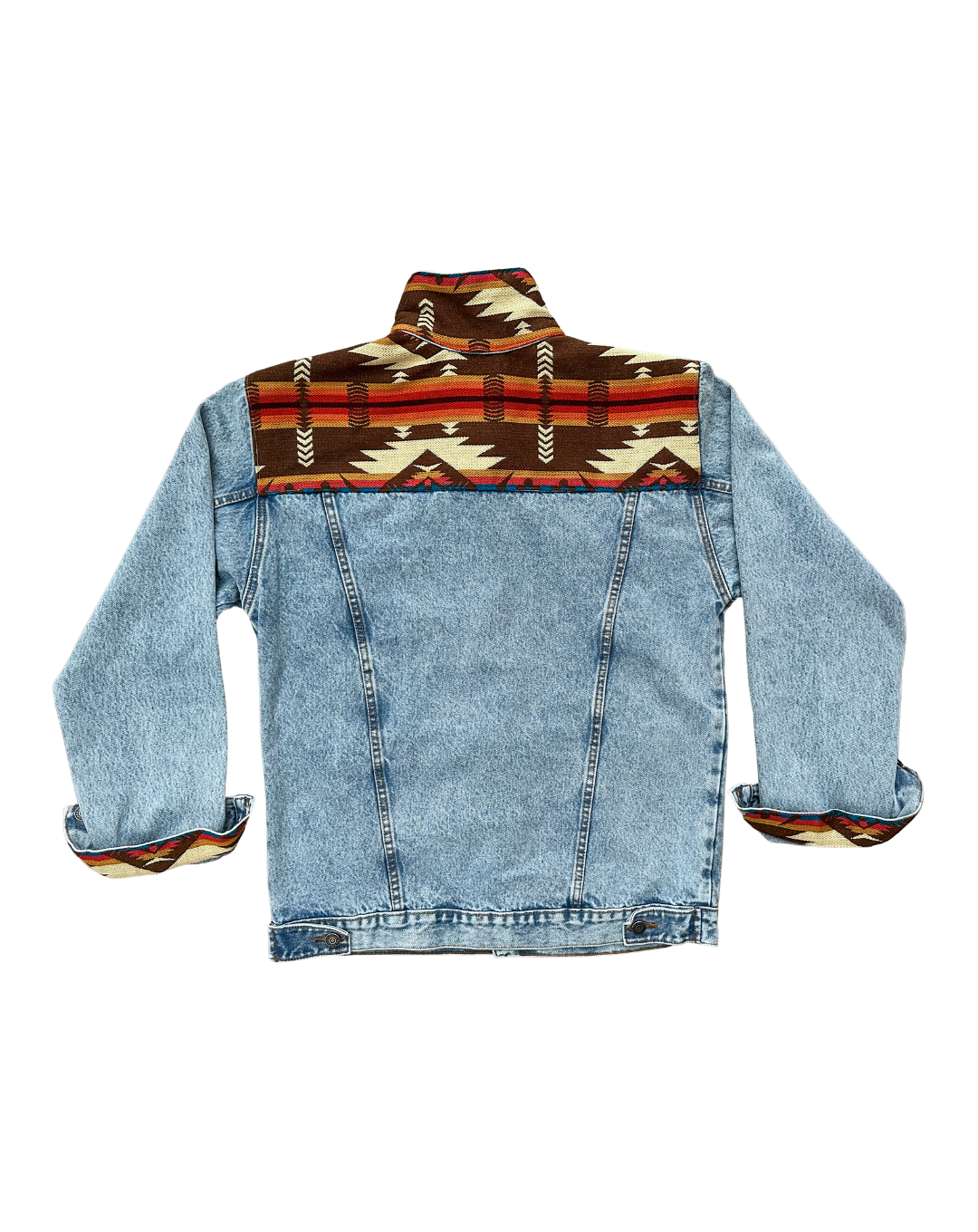 Una chaqueta unisex de denim premium que captura los hermosos tonos de la madera. El diseño combina el fresco denim azul con la vibrante tela andina color terracota, reflejando las capas de la tierra en las montañas del Ecuador.