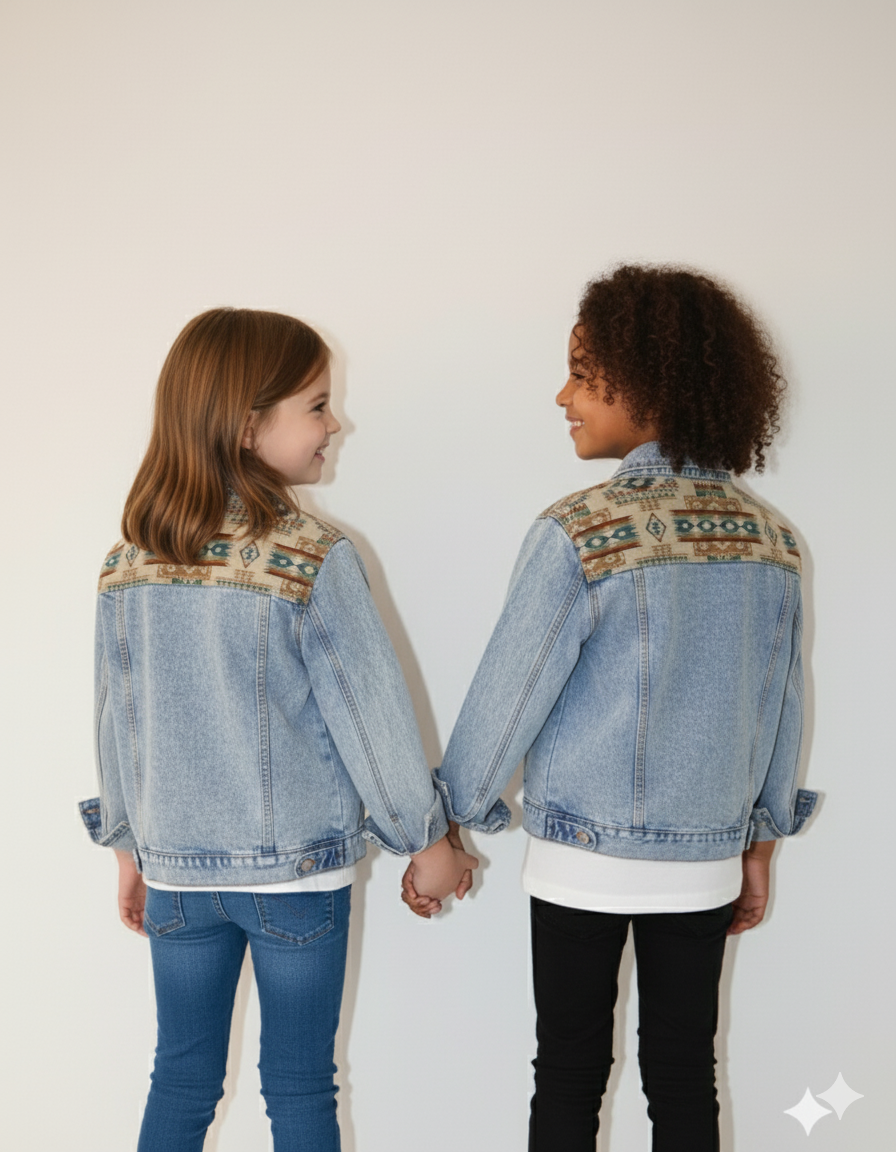 Chaqueta unisex de denim 12oz (100% algodón) con tela andina exclusiva en tonos cremas, azules y cafés. Hecha en Ecuador; cada pieza es única (los colores y texturas pueden variar).