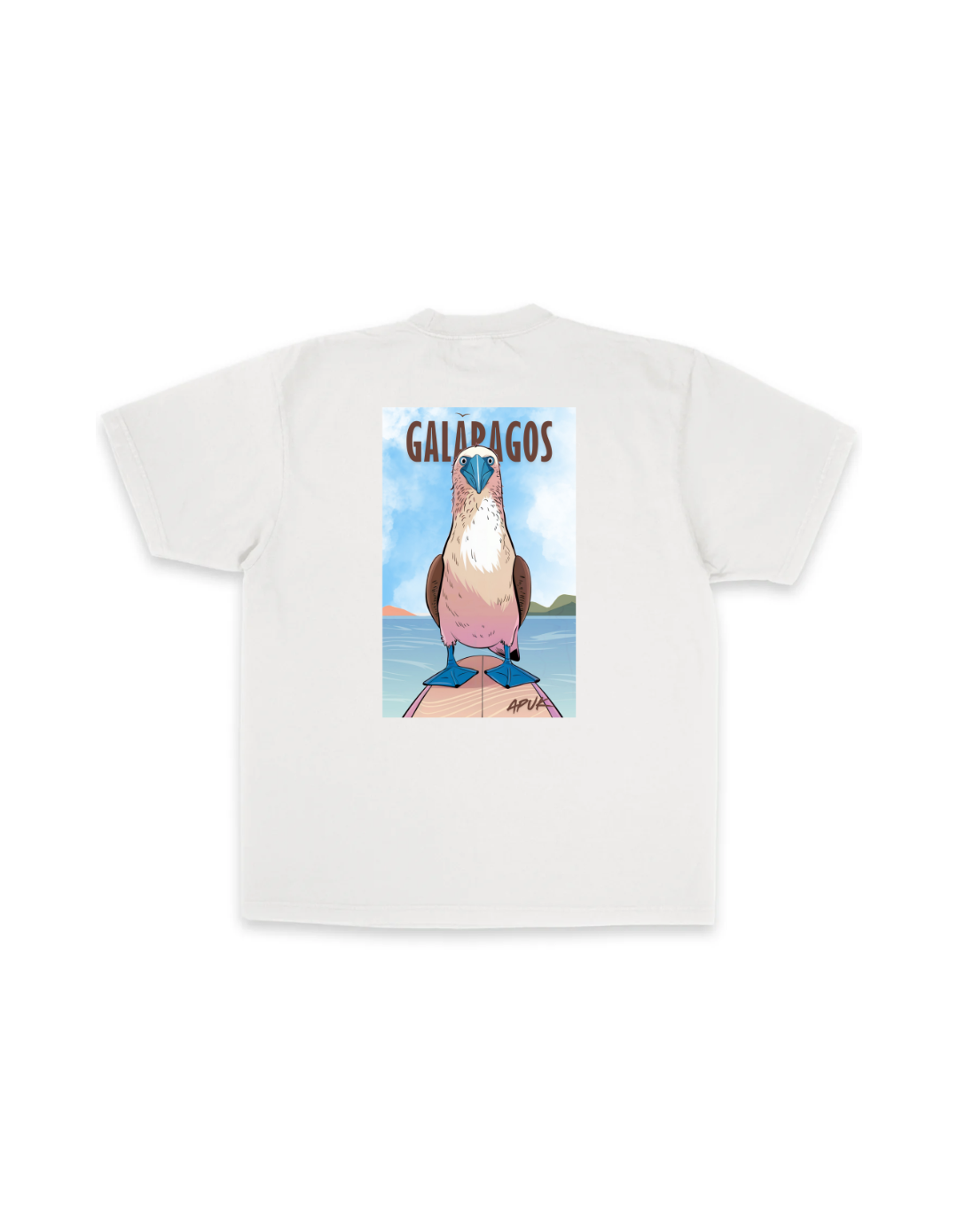 La camiseta "Blue-Footed Wave Raider" de Apuk Eco Apparel captura el espíritu divertido y único de las Islas Galápagos con un toque retro.