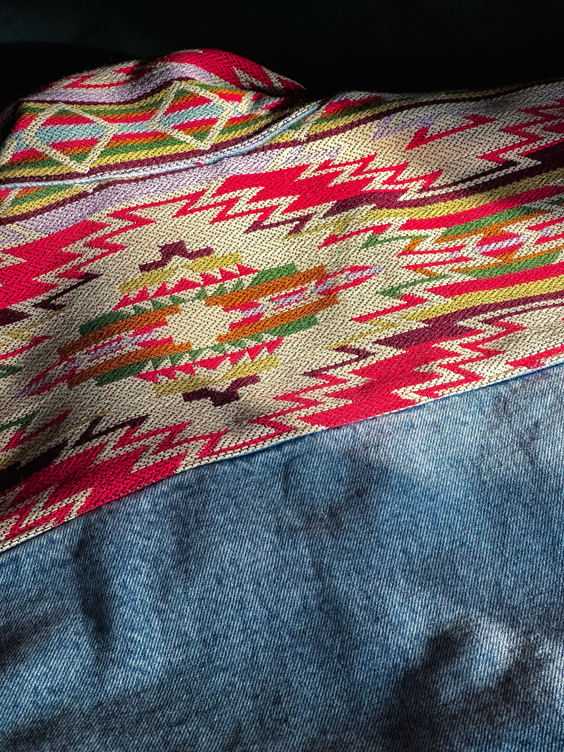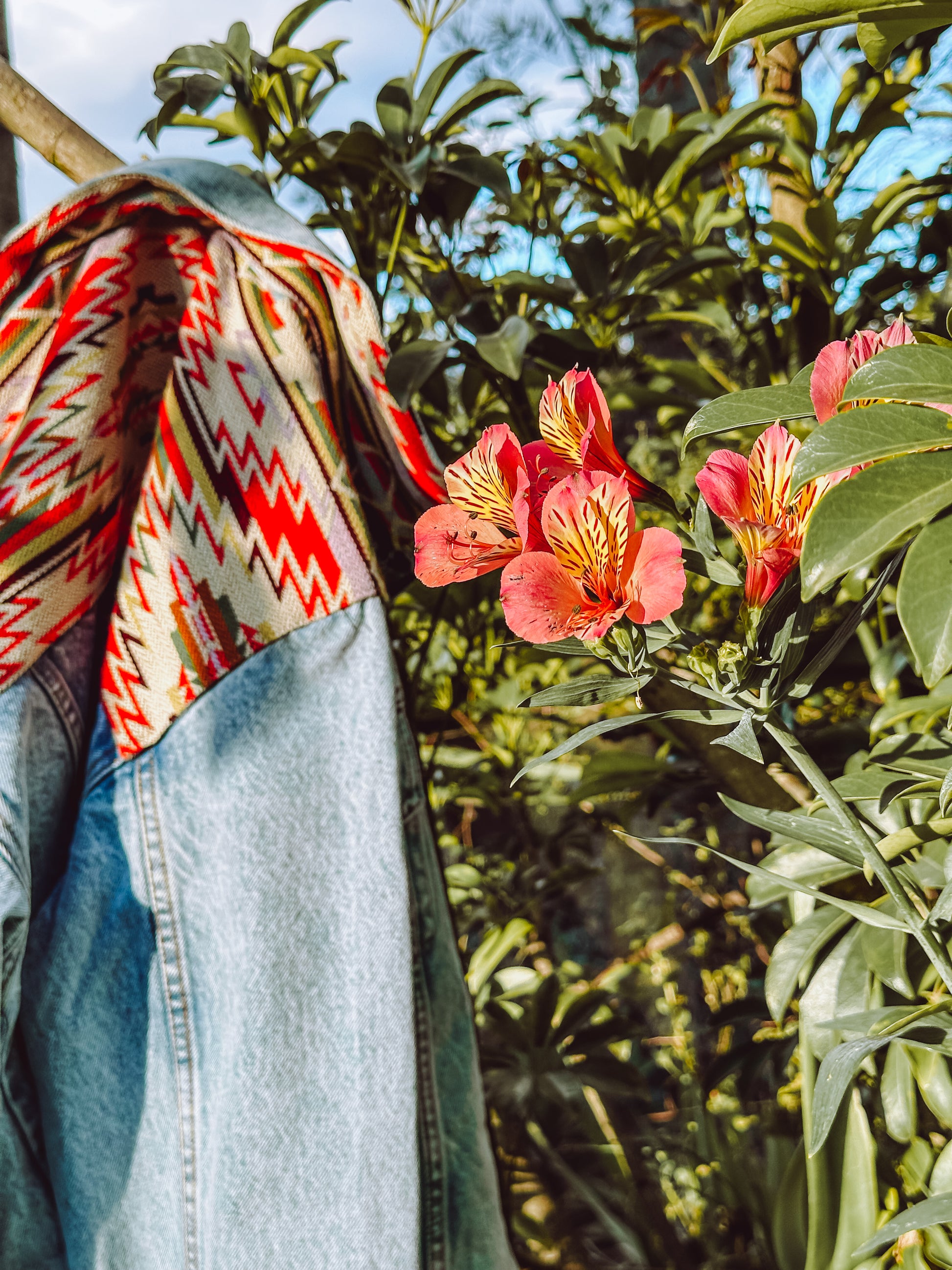 Un diseño exclusivo y sostenible, donde el denim premium azul frost se combina con tela andina Wave, reflejando vibrantes texturas eléctricas rosas. Inspirada en los amaneceres mágicos de Los Andes ecuatorianos, esta chaqueta es ideal para quienes buscan un estilo auténtico y llamativo.